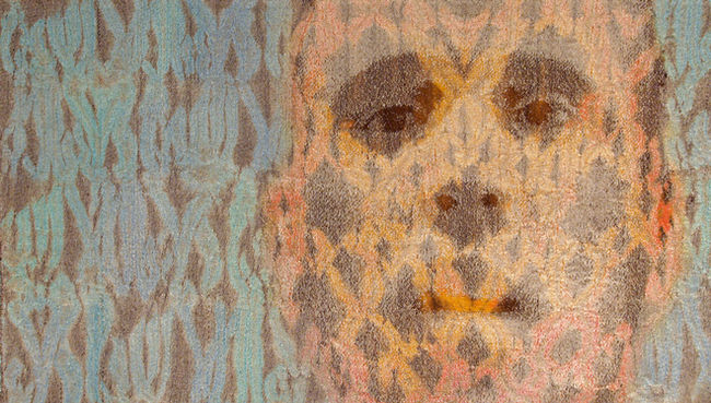 Working with a digital TC-2 thread-controller loom these portraits are woven in white and then dyed using a technique known as woven shibori, an ancient Japanese method for hand-dying fabric where the fabric is woven inserting a special supplementary weft which is pulled tight (like a tie-dye t-shirt) and then the cloth is dyed. The shibori threads are removed to reveal the dyed and woven image.